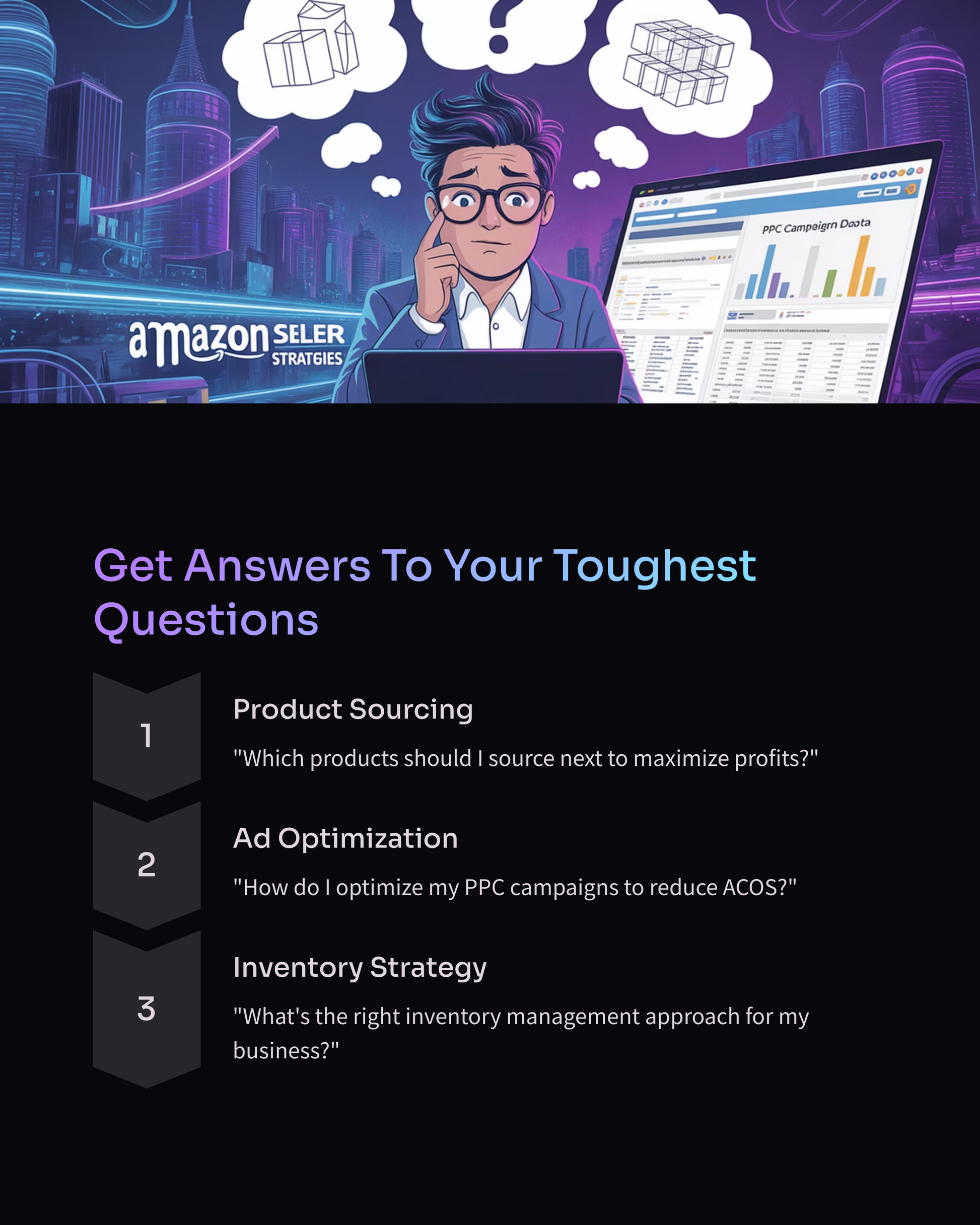 Get unstuck with personal coaching from experienced Amazon pros. Ask anything, get action steps.